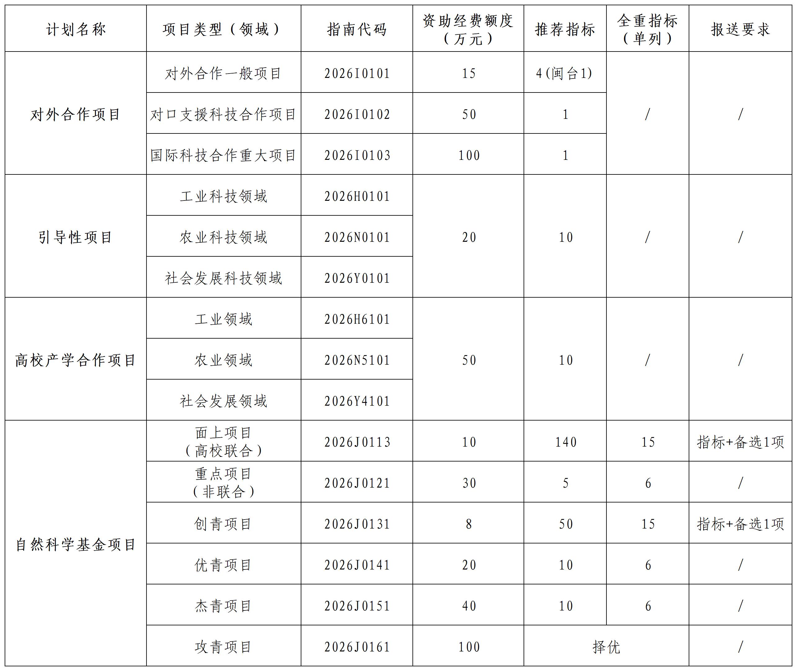 四、項(xiàng)目類型、指南代碼、資助經(jīng)費(fèi)額度、學(xué)校推薦指標(biāo)及二級(jí)單位報(bào)送要求