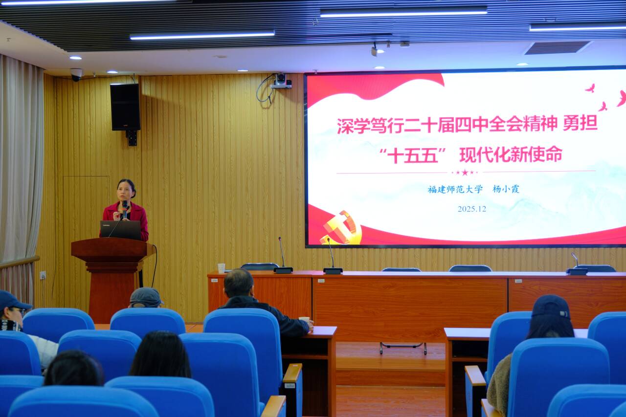 為深入學習貫徹黨的二十屆四中全會精神,準確把握全會精神的核心要義與實踐要求,切實將思想和行動統一到黨中央決策部署上來。12月3日下午,福建師范大學馬克思主義學院碩士生導師、福建省網絡教育名師、全國高校思政課教學能手楊小霞副教授應邀做客我校金山講壇第158講,在逸夫圖書館為我校師生作了題為《深學篤行黨的二十屆四中全會精神 勇擔“十五五”現代化新使命》的專題講座。圖書館黨委黨員及110余名師生到場聆聽。