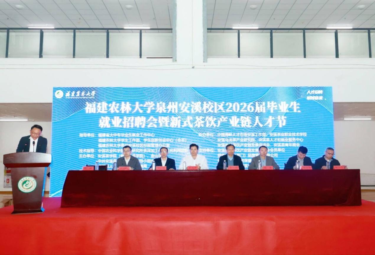 12月12日,由福建農林大學安溪茶學院(數字經濟學院)、金山學院、安溪縣委人才辦和縣人社局聯合主辦的泉州安溪校區2026屆畢業生就業招聘會暨新式茶飲產業鏈人才節于校區綠華體育館、懷德樓協同創新中心成功舉辦。開幕式由泉州安溪校區校園辦副主任洪濤主持,校園辦主任、安溪茶學院黨委書記黃成茂,中國農業科學院茶葉研究所茶葉深加工與多元化利用創新團隊首席科學家尹軍峰,校園辦副主任張云帆、陳勇、吳義炳,安溪縣虎邱鎮黨委書記陳智鋒,安溪縣茶業管理委員會辦公室副主任陳加勇,安溪縣新茶飲產業鏈發展促進會秘書長林筆志等蒞臨活動現場。安溪校區2026屆畢業生,52家企業參與本次活動。