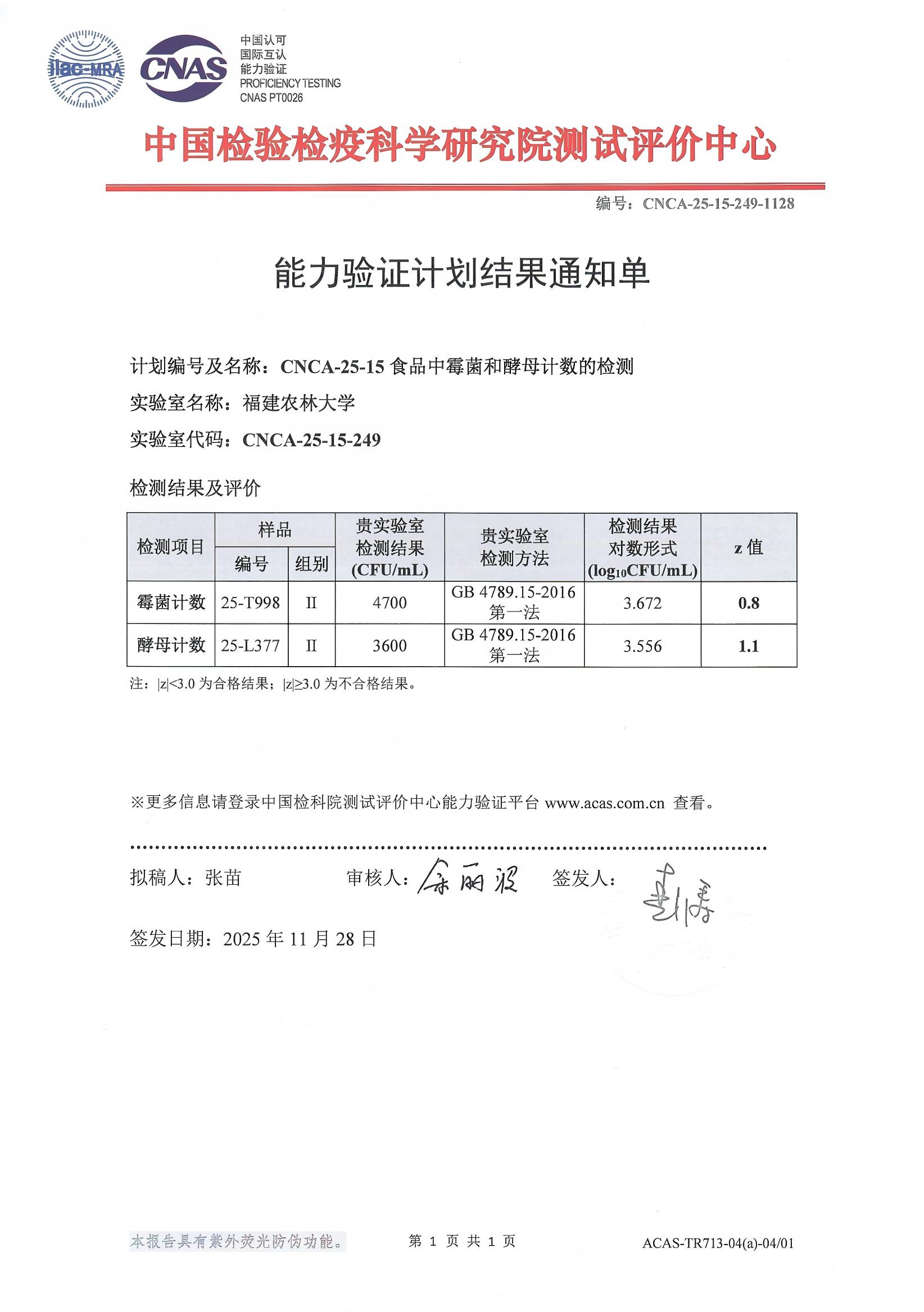 按照《農業農村部辦公廳關于開展2025年全國農產品質量安全檢驗檢測技術能力驗證的通知》(農辦質[2025]13號)和國家市場監管總局辦公廳關于開展2025年檢驗檢測能力驗證工作的通知(市監檢測發〔2025〕24號),我校農業農村部甘蔗及制品質量檢驗測試中心(下文簡稱中心)組織技術人員參加了農業農村部組織的《2025年畜禽產品中違禁添加物和獸藥殘留檢測能力驗證》、《2025年水產品檢驗檢測技術能力驗證》、《2025年部級農產品中農藥殘留檢測能力驗證》、《2025年農產品中重金屬檢測能力驗證》;以及國家市場監管總局組織的2025年國家級能力驗證計劃《CNCA-25-15食品中霉菌和酵母計數的檢測》共5項國家級能力驗證計劃。中心均獲評滿意結果。