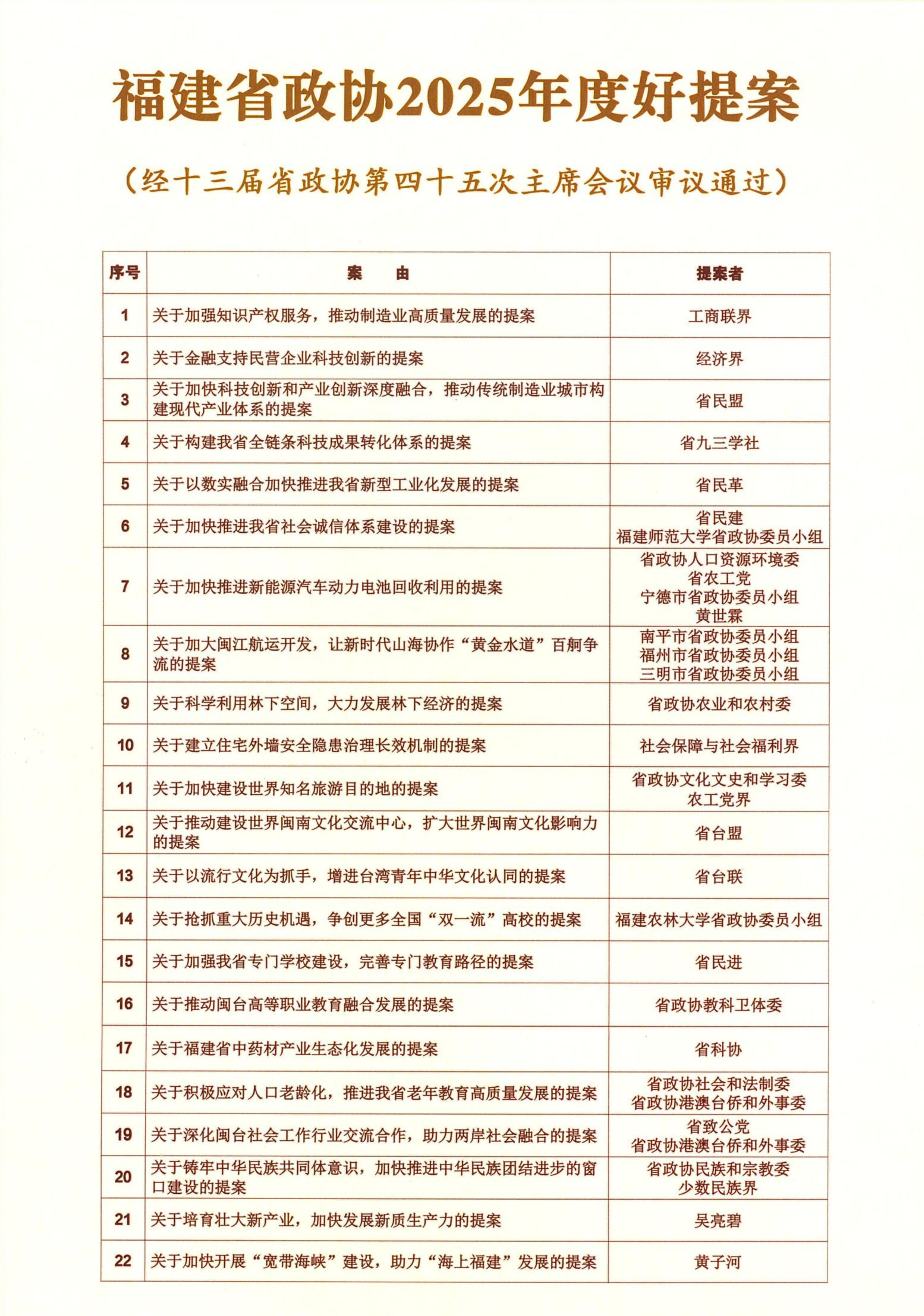 此次成果展示活動從提案工作切入,通過視頻短片系統回顧2025年省政協提案工作成效,并發布了50個“年度好提案”。50個年度好提案是從全年委員提出的1149件提案,經審查立案的930件中遴選出來的。這些提案集中展示2025年省政協委員聚焦“國之大者”“省之要事”“民之關切”進行提案履職的風采,充分展現省政協打造“為閩協商、為民服務”特色品牌的生動實踐。