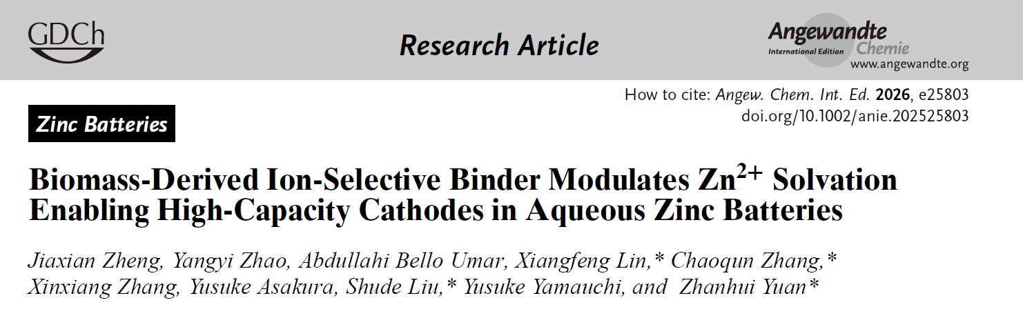 近日,福建農林大學材料工程學院袁占輝教授團隊在國際頂級期刊《Angewandte Chemie International Edition》(德國應用化學)在線發表了題為“Biomass-Derived Ion-Selective Binder Modulates Zn2+ Solvation Enabling High-Capacity Cathodes in Aqueous Zinc Batteries”(生物質衍生離子選擇性粘結劑調控Zn2+溶劑化結構構建水系鋅電池高容量正極)的研究論文。上述研究進展是袁占輝教授團隊在生物質水系電池材料基礎研究方面的重要突破。此前,袁占輝教授團隊成員在生物質水系鋅電池隔膜設計(Energy Environ. Sci., 2025, 18, 5457;Mater. Horiz., 2025, 12, 6252;Adv. Compos. Hybrid. Mater., 2025,8, 217; 中國造紙學報, 2025, 40,151-160)、鋅負極保護涂層(Chem. Eng. J., 2026,527,172018)和正極材料(Nano Lett., 2025,https://doi.org/10.1021/acs.nanolett.5c05008)設計方面取得了系列進展。基于上述工作,本研究提出了一種新型ι-卡拉膠(CAG)粘結劑用于二次水系金屬電池電極材料的制備,通過模擬細胞離子通道功能,實現選擇性離子配位和溶劑化結構調控,顯著提高電池容量。