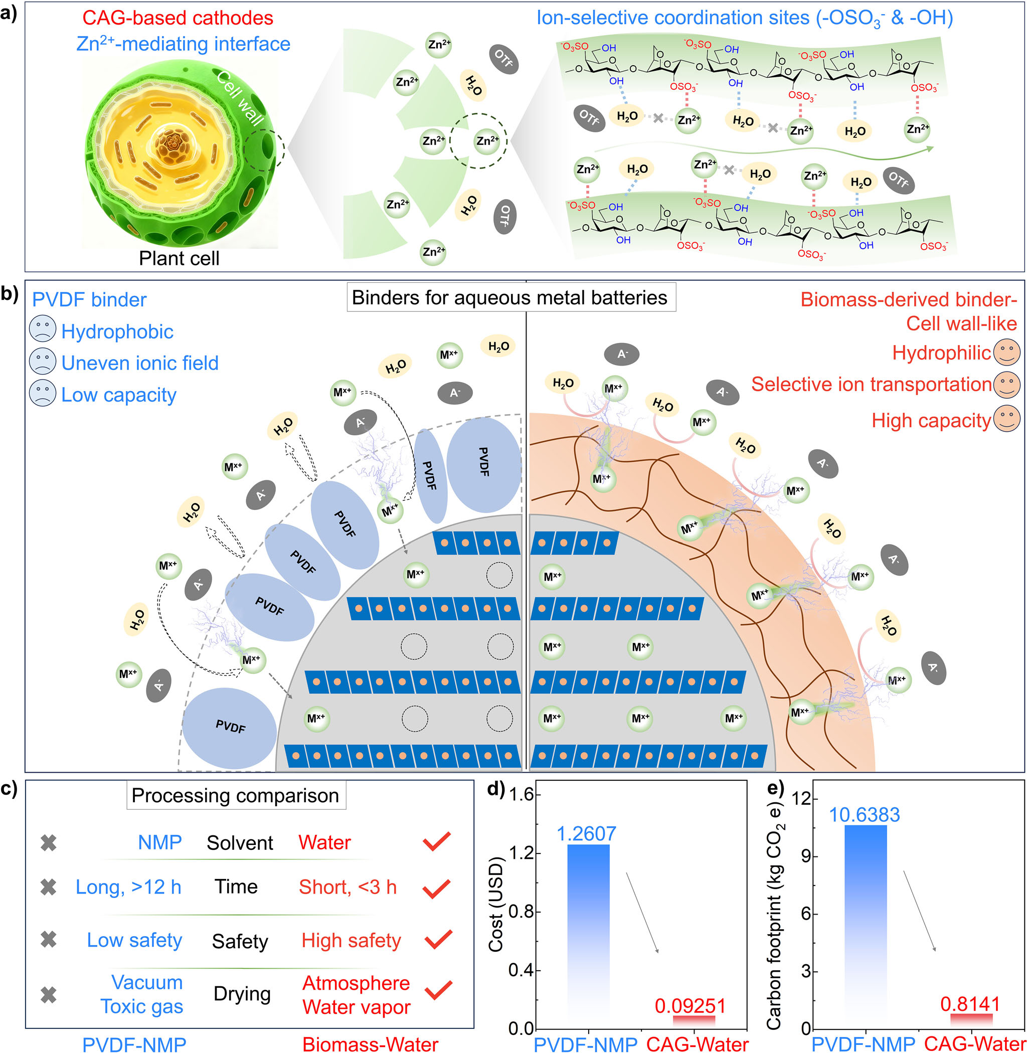 二次水系金屬電池因其安全、低成本和環境友好引起了廣泛的關注。聚偏氟乙烯(PVDF)是水系電池正極材料制備過程的常用粘結劑。然而,PVDF依靠弱范德華力來粘合活性材料和集流體,導致其在循環過程中結構穩定性不足。其次,在水系電解質環境中,PVDF的疏水性阻礙了電解液的有效滲透以及與正極材料的接觸,降低了正極活性材料的利用率和電池容量。此外,PVDF粘結劑需要使用有機溶劑(N-甲基吡咯烷酮)才能與活性物種和導電劑均勻混合,這給水系電池正極制備過程的環保、安全和成本帶來了額外的挑戰。因此,粘結劑對于水系電池的性能和加工成本有重要的影響。