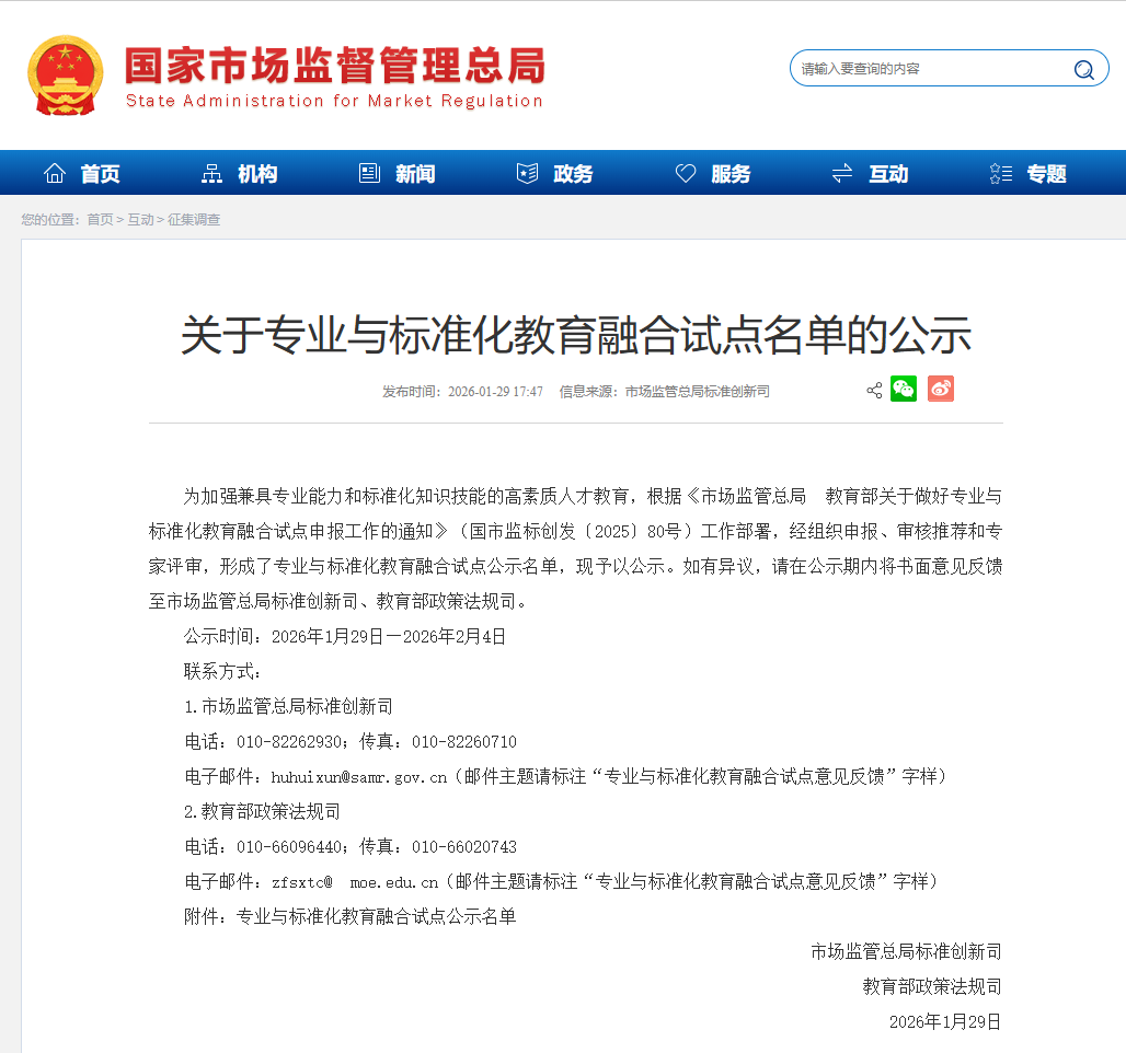 據悉,專業與標準化教育融合試點工作是貫徹落實《國家標準化發展綱要》和《教育強國建設規劃綱要(2024—2035年)》相關部署的重要舉措,旨在通過試點探索專業教育與標準化教育深度融合的有效路徑,培養一批產業發展急需的既有專業知識儲備,又熟練掌握標準化知識技能的復合型人才,推動教育鏈、人才鏈、產業鏈與創新鏈深度銜接。