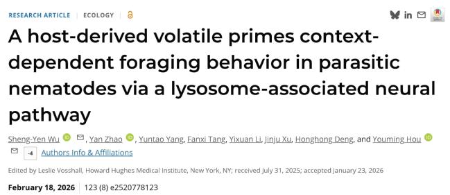 北京時(shí)間2026年2月25日,福建農(nóng)林大學(xué)侯有明院長教授/吳升晏教授團(tuán)隊(duì)在國際權(quán)威期刊《美國國家科學(xué)院院刊》(PNAS)發(fā)表研究成果并入選封面論文。論文題為“A host-derived volatile primes context-dependent foraging behavior in parasitic nematodes via a lysosome-associated neural pathway”(寄主來源揮發(fā)物驅(qū)動(dòng)寄生線蟲情境依賴型覓食行為的調(diào)控機(jī)制),突破傳統(tǒng)生防線蟲覓食行為分類框架,為生物防治因子行為調(diào)控與綠色防控技術(shù)發(fā)展提供了重要理論基礎(chǔ)。