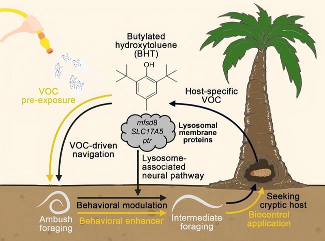在機(jī)制層面,研究進(jìn)一步從行為調(diào)控角度出發(fā),解析了溶酶體相關(guān)神經(jīng)通路在這一過程中所起的作用。結(jié)果表明,寄主揮發(fā)物信號(hào)能夠通過影響線蟲體內(nèi)相關(guān)轉(zhuǎn)運(yùn)系統(tǒng)與代謝狀態(tài),進(jìn)而改變其神經(jīng)活動(dòng)與行為輸出。研究成功將化學(xué)信號(hào)、能量代謝與行為響應(yīng)建立起關(guān)聯(lián),體現(xiàn)了從生態(tài)現(xiàn)象到生理調(diào)控的跨層級(jí)認(rèn)知整合。