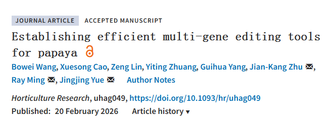 2026年2月20日,《園藝研究》Horticulture Research在線發表了我校岳晶晶和明瑞光團隊題為“Establishing efficient multi-gene editing tools for papaya”(構建多個高效的番木瓜基因編輯技術體系)的研究論文。