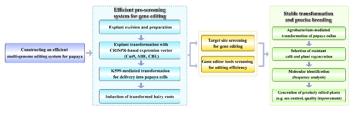 番木瓜(Carica papaya L.)是全球重要的熱帶果樹作物之一。其果實營養豐富,維生素和礦物質含量在水果中名列前茅,且富含番木瓜蛋白酶,在食品、醫藥和化妝品領域具有顯著的經濟價值。此外,番木瓜是開花植物中罕見的具有雌性,雄性和雌雄同株三種性別的物種,是研究植物性別決定機制的理想體系。盡管番木瓜具有重要的研究和經濟價值,但其遺傳轉化存在周期長、成本高、重復性差及基因編輯效率低等問題,嚴重制約了功能基因組學研究和精準育種進程。
