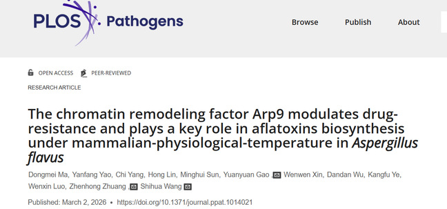 Ma D, Yao Y, Yang C, Lin H, Sun M, Gao Y, et al. The chromatin remodeling factor Arp9 modulates drug-resistance and plays a key role in aflatoxins biosynthesis under mammalian-physiological temperature in Aspergillus flavus. PLoS Pathog, 2026, 22(3): e1014021. https://doi.org/10.1371/journal.ppat.1014021.