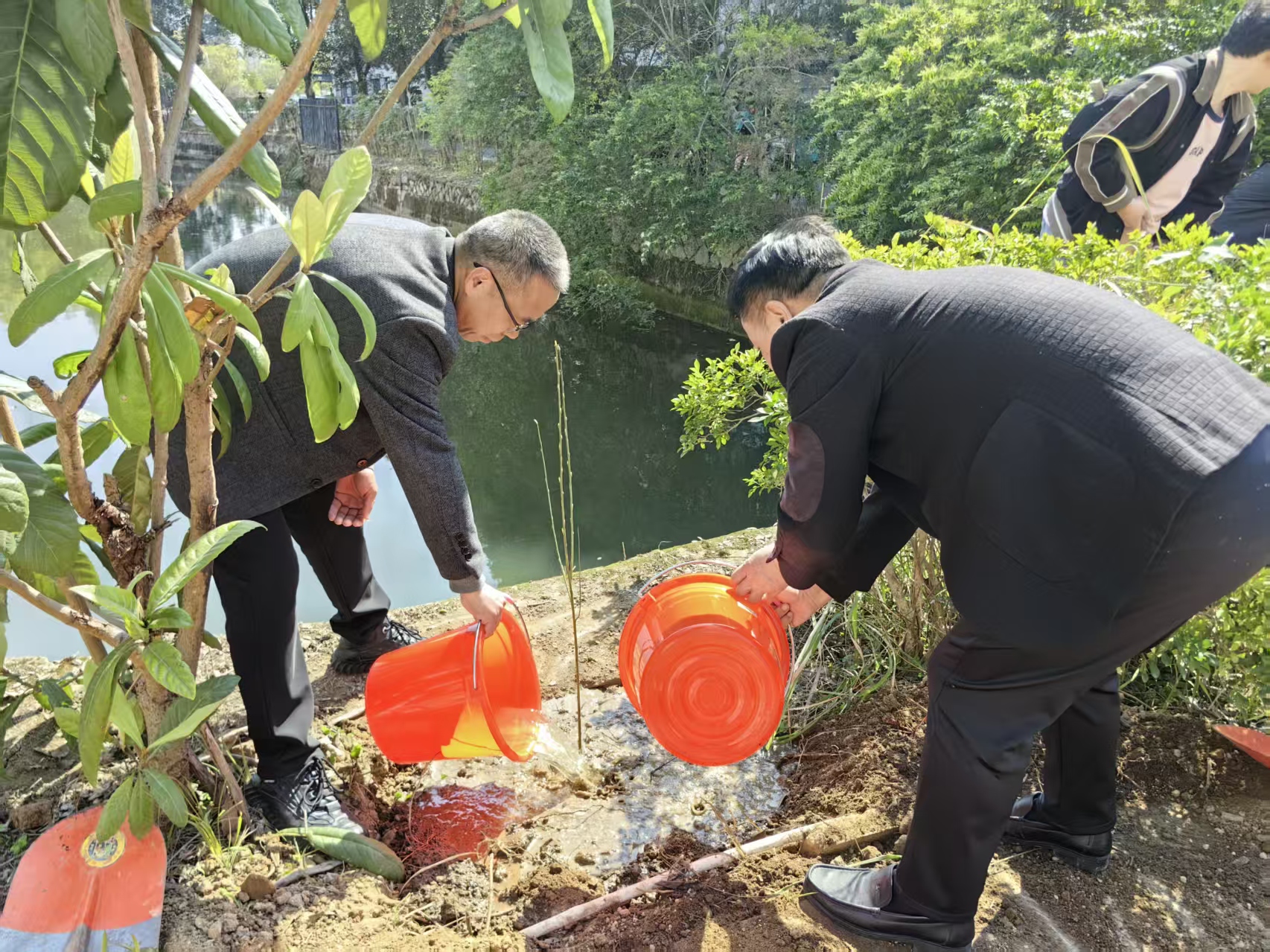 植樹現場暖意融融,黨員同志和師生代表分工協作、配合默契。揮鍬鏟土、扶苗填坑、提水澆灌……大家一絲不茍、步步到位,每道工序都認真細致,現場氣氛熱烈而有序。經過大家的共同努力,一株株新栽的桃樹苗穩穩扎根沃土,在春風中挺立吐綠,為春日的校園增添了盎然生機。