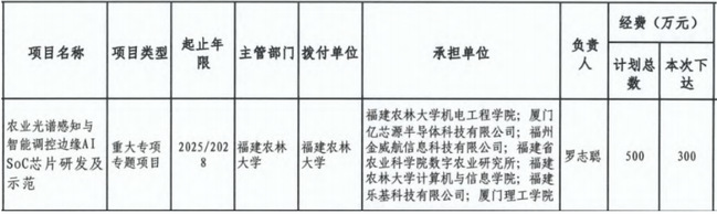 近日,福建省財政廳、福建省科學技術廳下達2025年度省 “揭榜掛帥(科技重大專項)” 項目經費通知。福建農林大學機電工程學院牽頭,聯合廈門億芯源半導體科技有限公司等單位共同申報的“農業光譜感知與智能調控邊緣AI SoC芯片研發及示范”項目成功獲批立項。項目總經費500萬元,首批300萬元已下達,標志著我校在“人工智能+農業”與集成電路交叉領域實現重要突破。