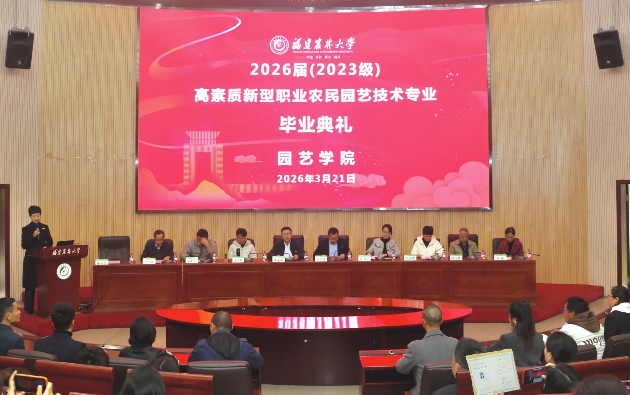 3月21日上午,福建農林大學園藝學院2026屆高素質新型職業農民園藝技術專業畢業典禮在博學報告廳舉行。園藝學院黨委書記孫思惟、黨委副書記康恩慧,校社會服務處副處長、鄉村振興學院副院長李文燦,學院各系部所負責人、黨政辦主任、班主任,鄉村振興學院學歷繼續教育負責人及全體畢業生參加典禮,典禮由康恩慧主持。