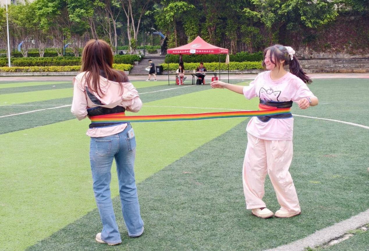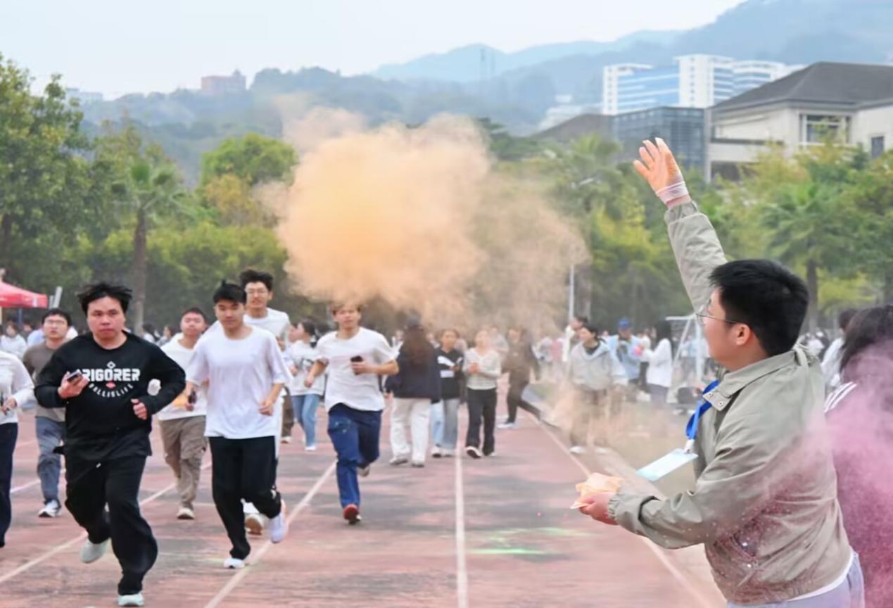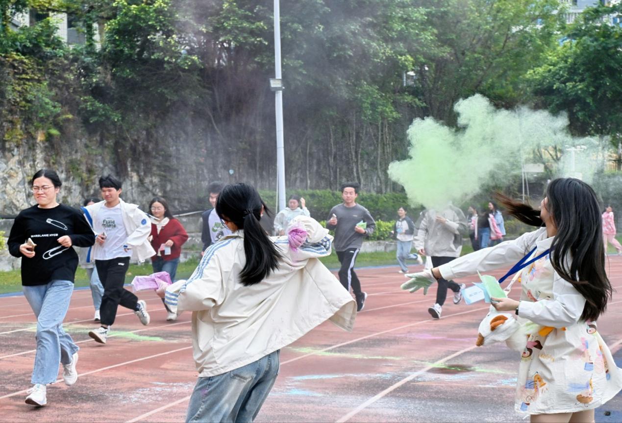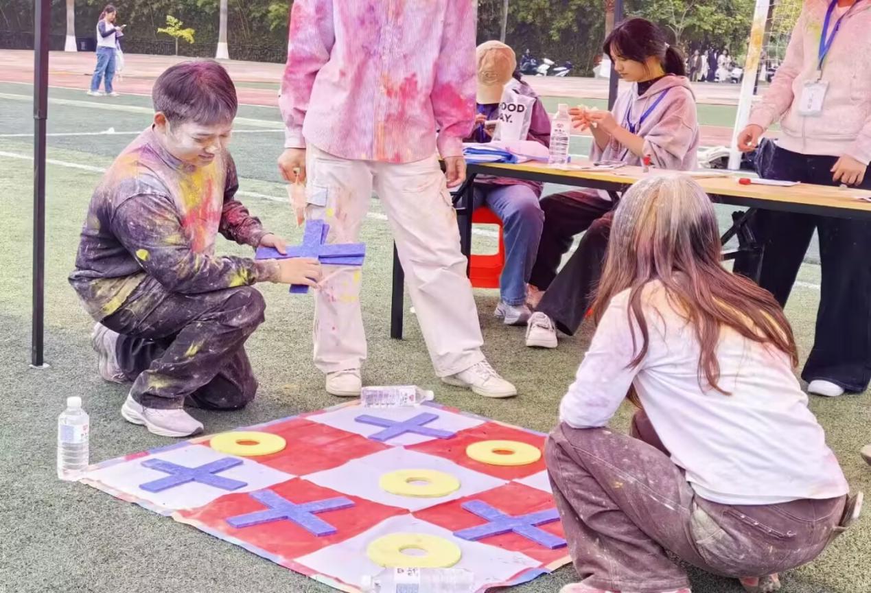 活動(dòng)以兩人組隊(duì)奔跑的形式開展,全程不受時(shí)間限制,沿途設(shè)有挑戰(zhàn)“背夾氣球”“愛的魔力轉(zhuǎn)圈圈”“極速三子棋”“反向指令大作戰(zhàn)”四個(gè)趣味游戲。田徑場內(nèi),多個(gè)彩色站點(diǎn)錯(cuò)落分布,工作人員不斷向途經(jīng)的選手拋灑彩粉,送上祝福與歡樂。有的同學(xué)一鼓作氣向前奔跑,有的則放慢腳步沉浸式參與游戲,現(xiàn)場笑聲不斷、熱鬧非凡。