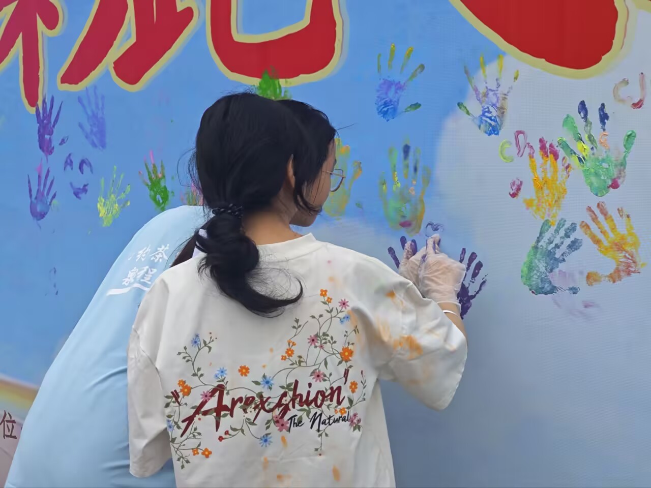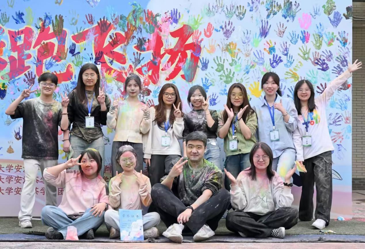 活動(dòng)尾聲,全體參與者共同將蘸滿繽紛顏料的手掌拓印于背景板之上。色彩斑斕的掌印層層鋪展、交相輝映,在現(xiàn)場熱烈的嬉笑聲中,匯聚成一幅充滿活力的青春畫卷,定格下專屬于校園的美好記憶與蓬勃朝氣。
