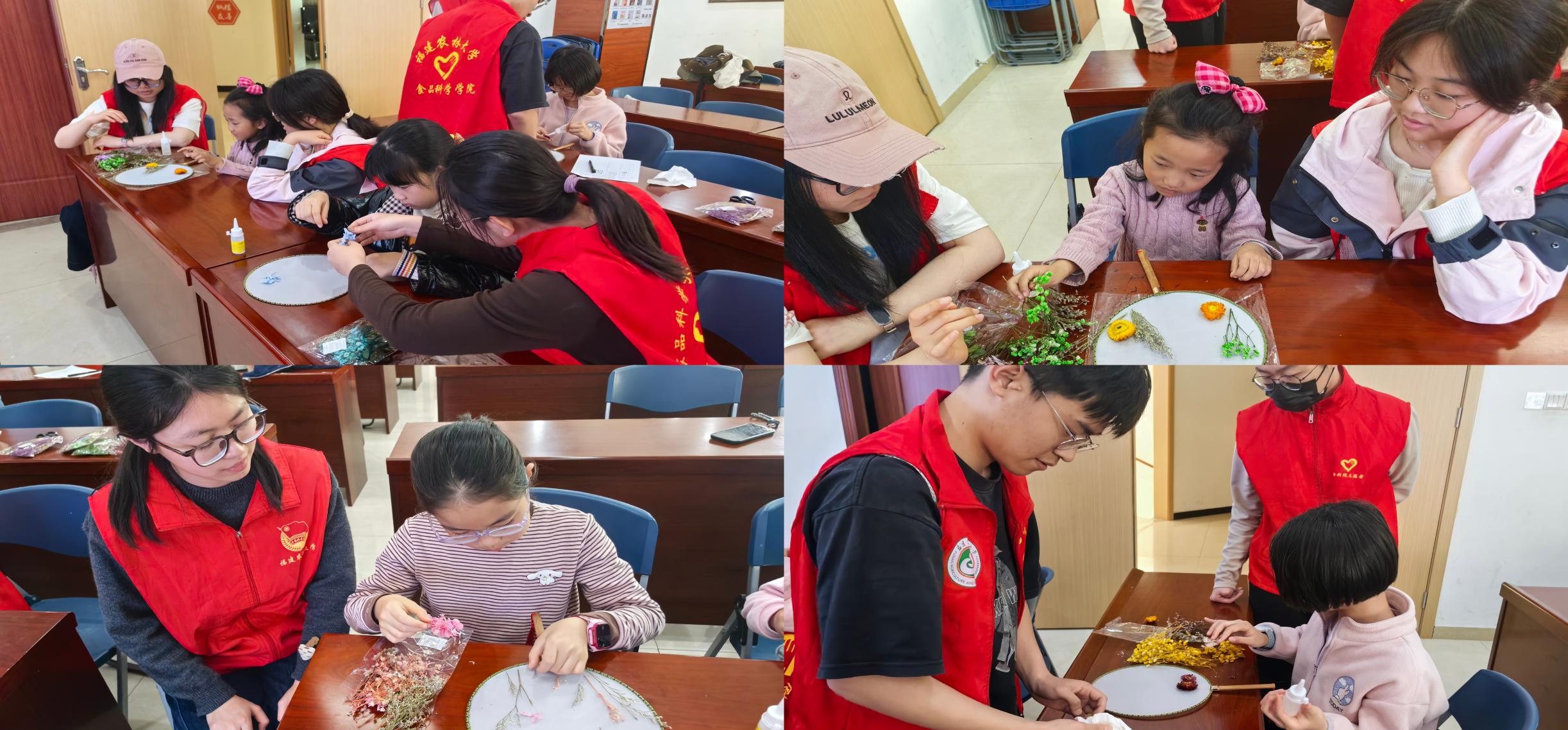 小朋友們在志愿者的耐心指導下,充分發揮想象力與創造力,精心挑選滿天星、雛菊、楓葉等干花材料,細心搭配色彩與構圖,在素白的團扇面上拼貼出花朵綻放、蝴蝶翩躚、小動物嬉戲等生動圖案。每一把團扇都獨具特色,既展現了自然植物的清雅之美,也承載著孩子們對健康生活的美好向往。制作過程中,志愿者不斷引導孩子們思考:正如干花保留了鮮花的美麗,天然食材也能讓食物既美味又健康?;顒游猜暎∨笥褌兪殖肿髌泛嫌傲裟?,臉上洋溢著滿滿的成就感。