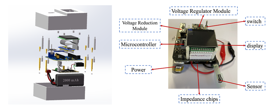 圖3 便攜式電化學(xué)檢測裝置的爆炸圖和物理示意圖