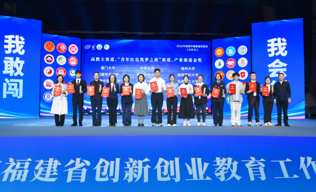 會上,舉行了2025年省賽各賽道金獎頒獎儀式,宣讀了萌芽賽道集體獎、各賽道優(yōu)秀組織獎獲獎單位名單,并進行了2026年“青年紅色筑夢之旅”交接儀式,曾華平代表福建農(nóng)林大學(xué)作為承辦校接旗。其中,我校在2025年福建省大學(xué)生創(chuàng)新大賽中斬獲9項金獎、8項銀獎和9項銅獎,并榮獲高教主賽道、“紅旅”賽道、產(chǎn)業(yè)賽道高校優(yōu)秀組織獎。南京理工大學(xué)、寧波大學(xué)、集美大學(xué)誠毅學(xué)院、福州大學(xué)、福建師范大學(xué)、蘇州工學(xué)院等有關(guān)高校負責(zé)同志作了專題分享、路演分享和專題培訓(xùn)。
